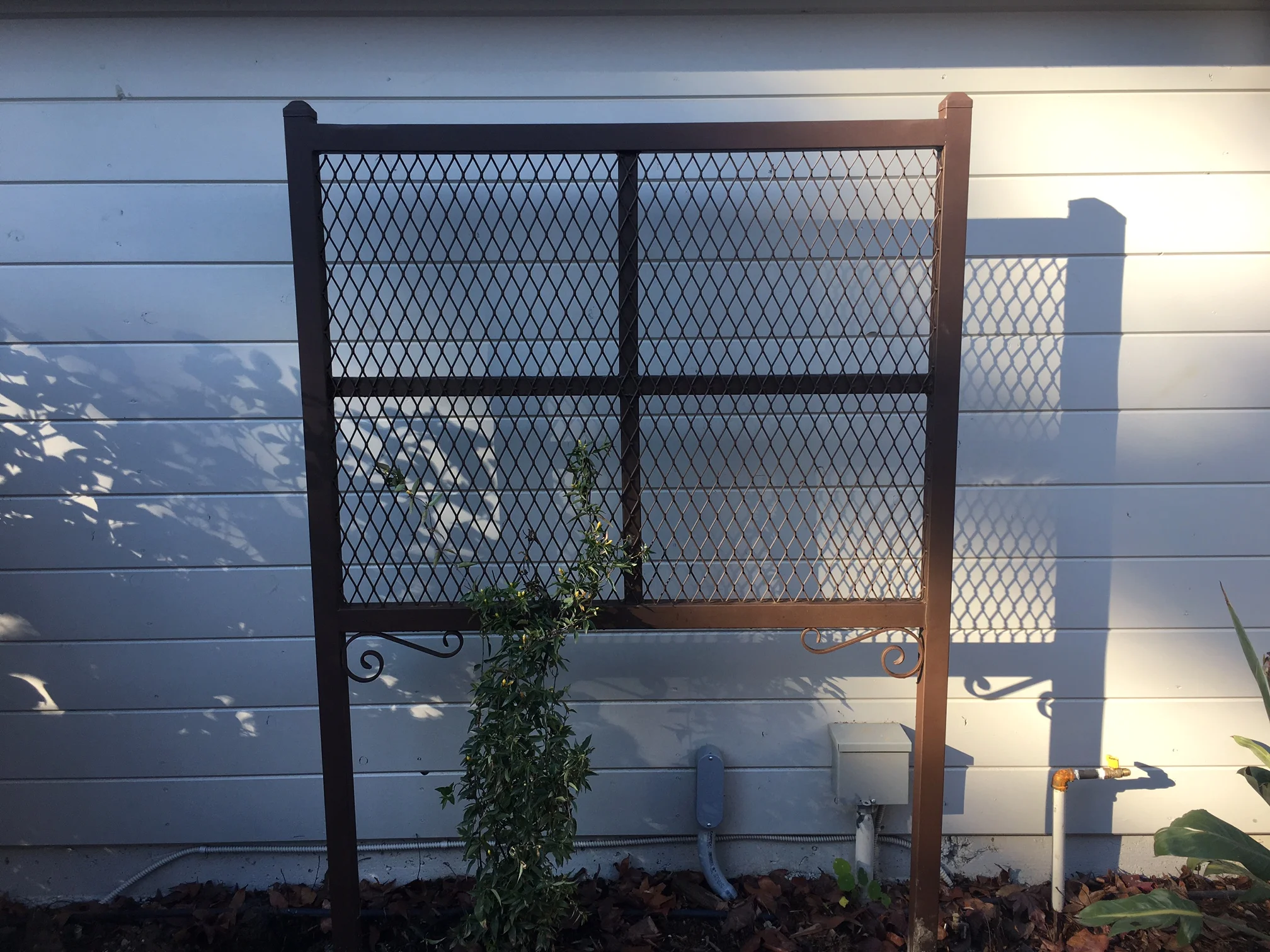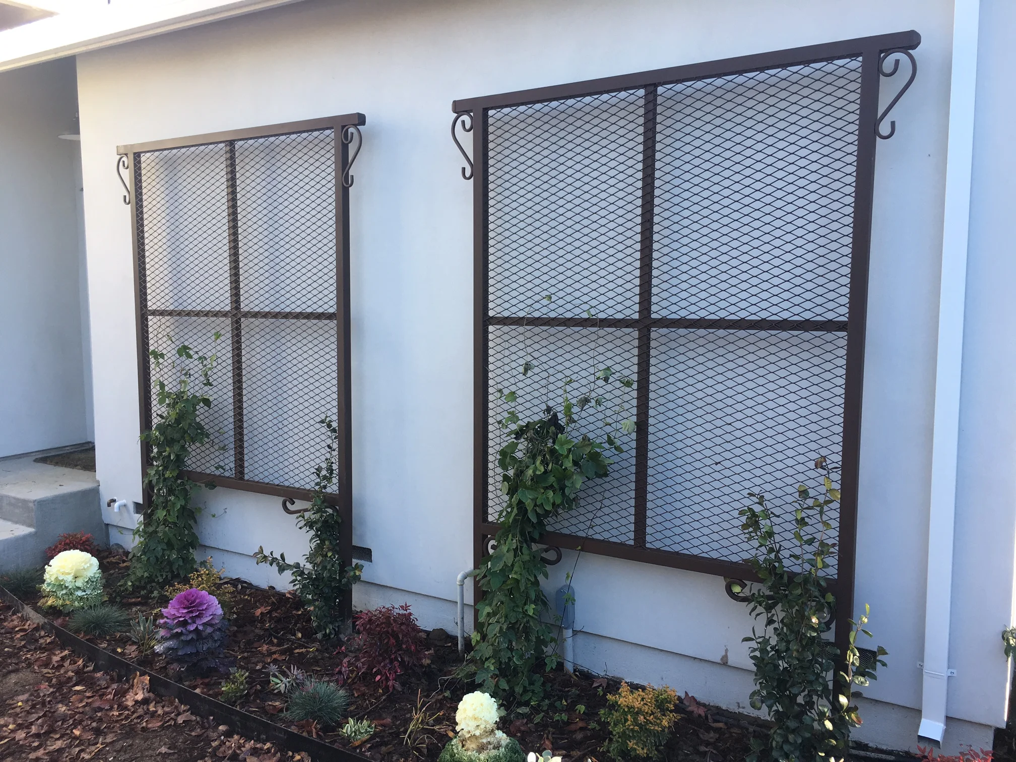 Trellises are built from 16 gauge steel and anchor in the ground away from from a wall or fence. As shown above, the trellises provide support for vine growth and protect your wall structure from plant intrusion.